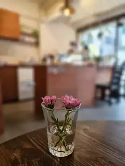 The space is cozy, and the small decorations and warm interior design create a snug atmosphere. Each table is adorned with a cup holding flowers, making it irresistible to take photos even before the coffee arrives.