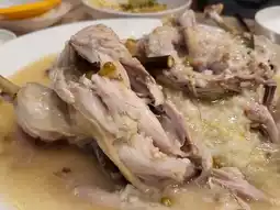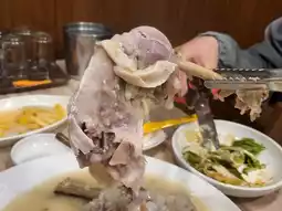 The much-anticipated baeksuk (Korean boiled chicken) has arrived. The chicken drumstick is impressively large. It’s been cooked so well that the leg bone has completely separated from the meat.