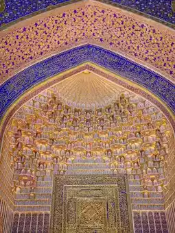 The Ulughbek Madrasah on the left was built by the famous mathematician and astronomer Ulughbeg. As it was built in the same place, the interior is filled with astronomical elements, like outer space 🪐