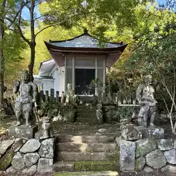Nationally designated Important Cultural Properties: Wooden statues of Taroten and two children, and a bronze Lotus Sutra are housed in the storage room. Admission fee: ¥500.