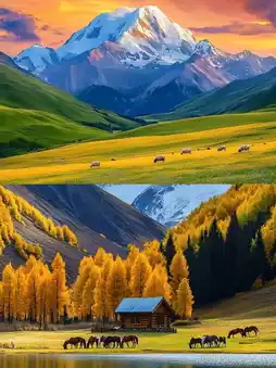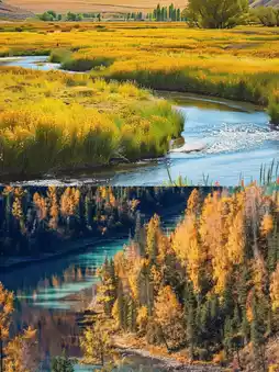 The sky here is as blue as a gem, and the clouds are like cotton candy floating in the air. The mountains are undulating, gently wrapped in white snow, sparkling under the sun. Stroll along the shores of Lake Kanas, the lake water is as clear as a mirror, reflecting the golden birch forest on the shore, like a magnificent oil painting.