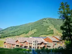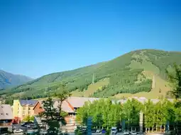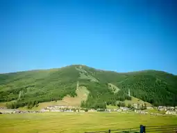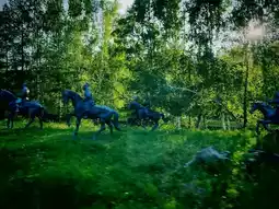 The hotel is embraced by lush green mountains. Vast meadows shimmer under the sunlight, while scattered buildings blend harmoniously with the distant landscape. Tourist infrastructure is evident from the high-voltage power lines on the far hillside and road signs pointing to 'The Brich Forest Resort Hotel / Yingdenggu Auto Camp'. Amidst the foliage, horse sculptures stand beside fresh trees under the azure sky – all coalescing into a scene of serene beauty.