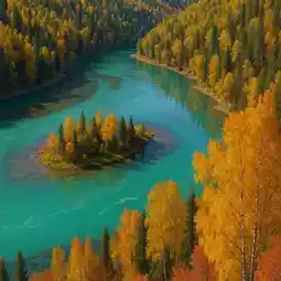 • Kanas Lake – shimmering turquoise waters framed by fiery autumn colors.