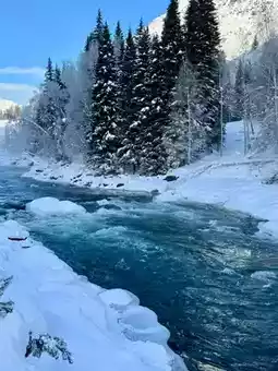 : Kanas Lake is ethereal, with snow mushrooms quietly watching by the riverbank, and the rime on the lakeside is like a work of art, inviting admiration