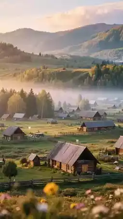 🌫️Morning light penetrates trees, mist flows like silk, cooking smoke rises, like a dream