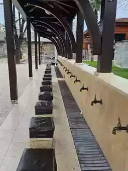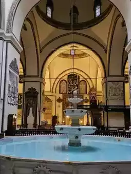 🕋 Spectacular Central Fountain (Şadırvan) —— The hexagonal marble fountain located in the center of the mosque serves as a place for ablution before prayers and brings a tranquil ambiance to the entire mosque.