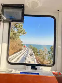 The Sky Capsule has windows on all sides, and the view of the sea and pine trees beyond the windows was amazing!!