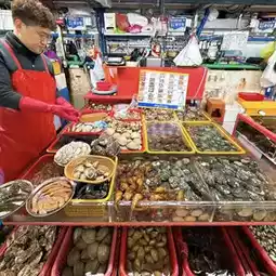 It is divided into an outdoor traditional market and a modern market inside a building, and of course there are dried fish and fresh live fish, but when you go inside, you can see large abalone, crabs, and sea urchins. Look to the side and you will see scallops, clams, and oysters.