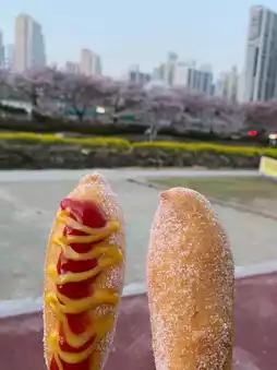 After looking at the flowers and taking pictures, I got hungry before I knew it. When I went up to Oncheoncheon, there were food trucks, so I could enjoy a simple meal. I bought a hot dog and my hungry stomach was full.