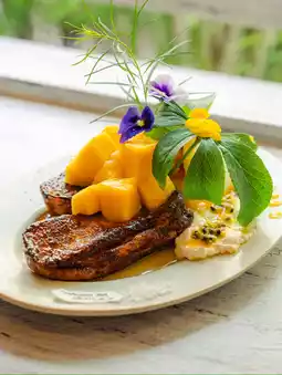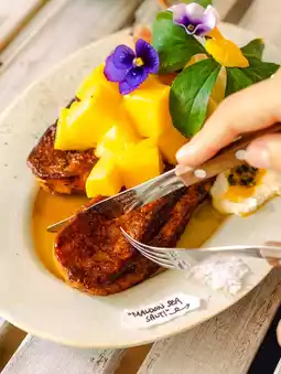 Classic Tokyo French Toast topped with fresh mango, pineapple, ham, white cheese sauce, and passion fruit puree.