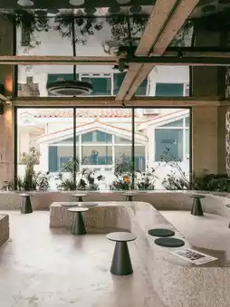 and the interior, which is composed of simple black tones and cement,