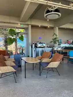 The view of the ocean and Sky Capsule from the large window inside the cafe is the best