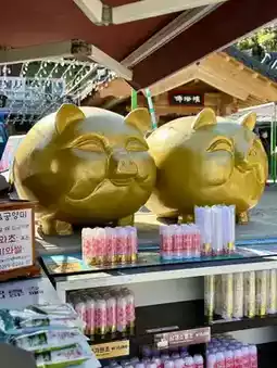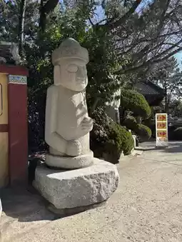 The temple grounds are home to various Buddhist statues, including stone statues of the 12 zodiac signs and the Dolhareubang, the guardian deity of Jeju Island. Visitors are also greeted by the Golden Pig and Hotei, who are said to bring good fortune.