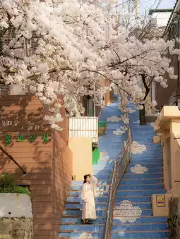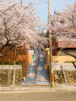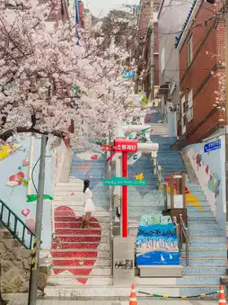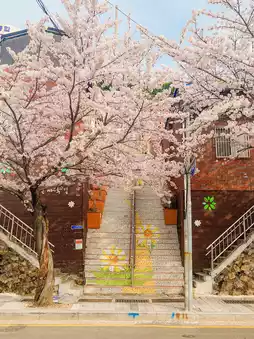Dakbatgol Mural Village, Busan's famous cherry blossom spot with cute staircase murals and cherry blossoms,