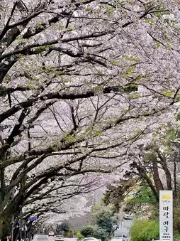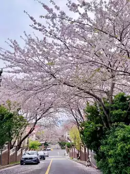 A gentle spring breeze blows as I walk along Yeongdo Road in Busan. Cherry blossoms bloom on both sides, creating a pink sea of flowers that perfectly complements the winding path, making it feel like a stroll through a springtime poem. As I continue along the trail, the breeze gently stirs, and cherry blossom petals fall like fine rain, covering the entire street and adding a touch of romance to this tranquil mountain town. In the distance, the skyline of Busan appears faintly, with cherry blossoms and red-tiled houses blending into a picturesque scene under the blue sky. Visitors stop to take photos, capturing this season's dreamy scenery. Climbing up to the observation deck, I overlook the entire cherry blossom avenue, where the pink and white flowers shimmer softly in the sunlight, reflecting off the distant sea. I stand quietly under the cherry trees, soaking in the tranquility and poetry of this spring day, looking forward to my next visit to Yeongdo Road to enjoy the springtime with these fluttering cherry blossoms.