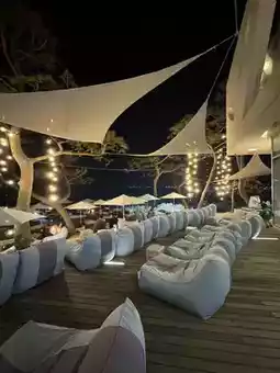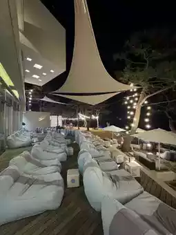 A cafe with everything from a large indoor space to an outdoor terrace space where you can lie down on a beanbag and look at the ocean view!