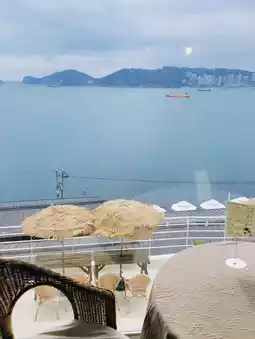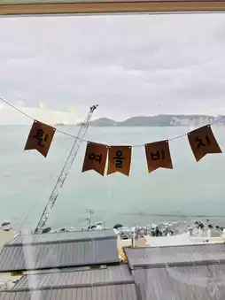 This popular cafe, Huinnyeoul Beach, is hidden next to the Baeksand Cultural Village in Busan. It is very easy to recognize and find as soon as you walk in from the alley.