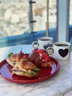 The cafe is on the upper floor, and you can enjoy delicious coffee and large croissants🥐 filled with fruit and cream in the morning.