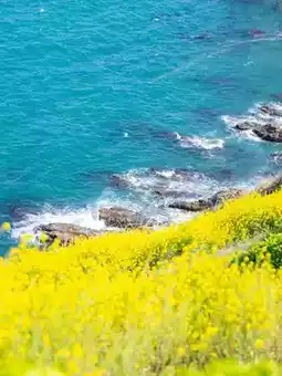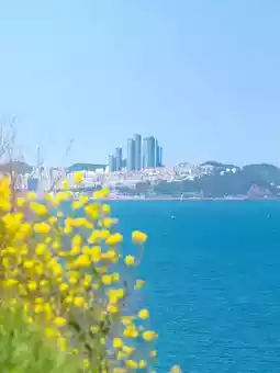 The cool sea of Oryukdo Island and the yellow color of the rapeseed flowers