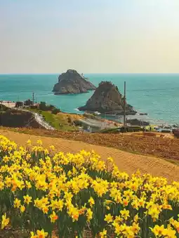 ๐ท Coming here in the spring, you will be able to freely admire and take pictures with colorful flowers such as rapeseed flowers, daffodils. If you go towards the park ์ค๋ฅ๋ ํด๋ง์ด๊ณต์, there will be a walking path to the land extending to the sea and above is a cajuput forest full of yellow daffodils. In addition, you can also go to the glass bridge ์ค๋ฅ๋ to admire the view from above and if you want to see the sunrise, come early to enjoy it.
