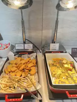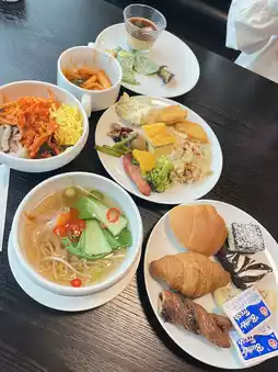 Dining Options: Offers a variety of snacks and beverages, including a salad bar, bread, cup noodles, draft beer, soft drinks, and coffee.