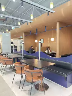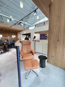 Amenities: Equipped with free Wi-Fi, charging stations, newspapers/magazines, and flight information monitors for added convenience.