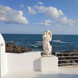 The white building and blue points reminiscent of Santorini give it a neat and sophisticated feel visually.