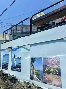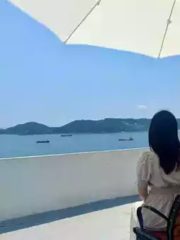 An elegant café perched on a hilltop, featuring a minimalist white interior and breathtaking panoramic views of the blue ocean. Enjoying a latte on the terrace while feeling the sea breeze is a truly relaxing experience.