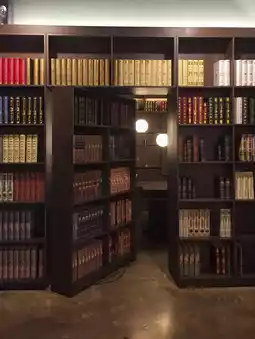 The Harry Potter-style bookshelf door and antique interior are charming!