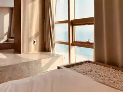 One of the most remarkable aspects of UH Suite the Haeundae is its superb views. As seen in the image, the suites often feature expansive windows, some even offering a deep soaking tub right by the window, providing an unparalleled outlook onto the cityscape and the ocean beyond. Imagine relaxing in your room with such a stunning backdrop!