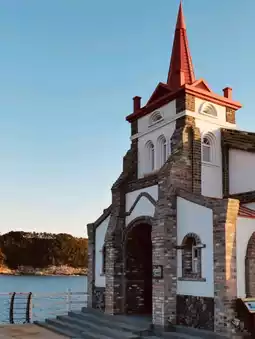 Perched dramatically on a rocky outcrop right by the sea in Gijang-gun, the "cathedral" boasts a charming, somewhat whimsical design that evokes images of a European coastal church. Its stone walls, pointed roof, and small bell tower stand in beautiful contrast against the wild blue ocean, creating a truly idyllic and romantic scene. The sounds of waves crashing nearby complete the immersive coastal atmosphere.