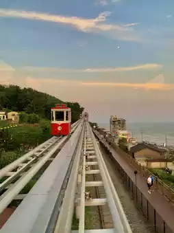 ββ A rail car running along the coastal route from Mipo to Cheongsapo. The view outside the window is stunningβperfect for taking photos.