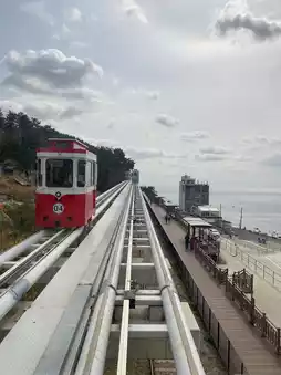 This Sky Capsule train, located within Blue Line Park, is a small, scenic train that travels slowly from Mipo Station to Cheongsapo Station in approximately 30 minutes.