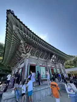 π Perched on a cliff by the sea, Haedong Yonggungsa is one of the few coastal temples in South Korea. The main hall (Daeungjeon) faces the East Sea, adorned with vibrant dancheong patterns and intricate carvings.