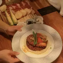 With its warm lighting that creates a comfortable yet stylish ambiance, it's the perfect place for a romantic evening with friends or a loved one. The menu offers a variety of dishes, including salads, steaks, and pasta, making it an excellent choice for dinner as well!