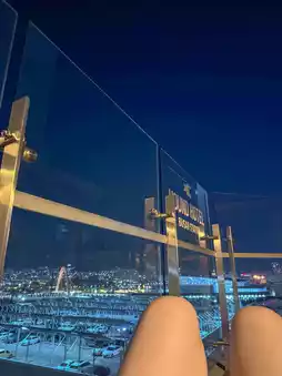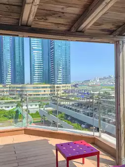 The private outdoor terrace features a swing, table, and sunbeds, offering a romantic view of Busan Port.