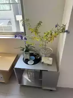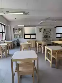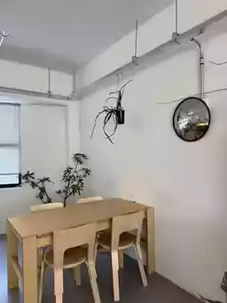 The interior is stylish, featuring a white theme, wooden furniture, and greenery.