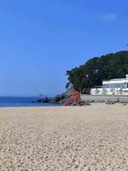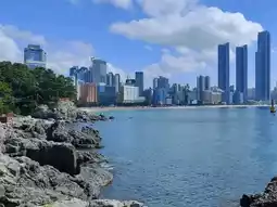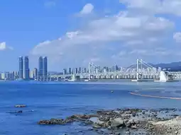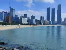 From Haeundae Beach, you can walk to Dongbaek Island and take in the breathtaking views of Haeundae Beach's shoreline, Oryukdo Islands, and Gwangandaegyo Bridge, all beautifully set against the shimmering emerald sea.