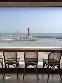 The building is three stories tall, and the third floor features a cafe space with a panoramic ocean view, perfect for a relaxing time♡
