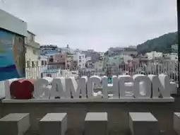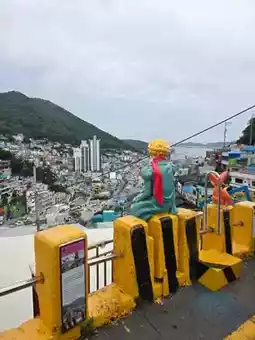The spot where the Prince and the Desert Fox from Saint-Exupéry's "The Little Prince" perch on the guardrail is a popular spot in Gamcheon Culture Village.