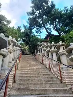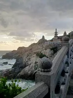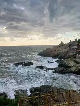 On a day filled with clouds instead of sunshine, the scenery of Yonggungsa Temple feels even more overwhelming. The sea, cliffs, and gray sky blend together to create a mysterious and majestic atmosphere. The sound of waves, combined with the ambient noises, feels like meditative music, calming the mind. As you climb the stairs, the blue coastline reveals itself, changing colors depending on the light breaking through the clouds, creating a magical view. The contrast between the red tiled roofs and the grayish-blue sea is striking, making it a popular spot for photography. Even with strong winds, the peace atop the cliff keeps you lingering. The tranquility that deepens on cloudy days resonates deeply within, making this temple truly special.