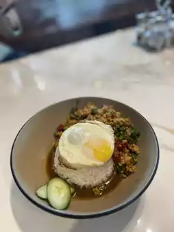 At Siam 9 in Butterworth, their Pad Krapao Gai (Thai basil chicken) is a standout that shows off what good Thai comfort food should be. The minced chicken is stir-fried with lots of garlic, bursts of chilies, and plenty of holy basil, giving it that bold, mouth-tingling fragrance. It’s served over fragrant jasmine rice, topped with a perfectly done fried egg whose runny yolk adds richness. The spice level is lively but manageable, so you still taste the sweetness from the basil and the savoury notes from the sauce. It’s simple, satisfying, and hits all the right flavour notes.