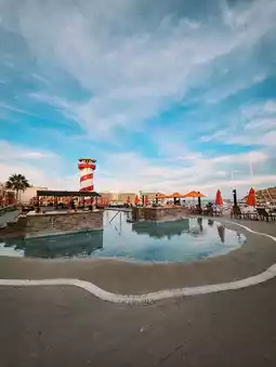 🏢The hotel itself is huge — two buildings linked by a bridge, and there's a tall lighthouse nearby that makes it feel like your own personal landmark. You can always spot your hotel from anywhere in the marina 🗼