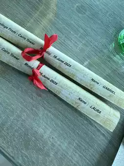 At the top, we were offered a personalized scroll with our names written in ancient ##pharaonic script, along with the meaning of each letter related to personality traits. The scroll included the date of our visit and was printed on ##papyrus -style paper.
