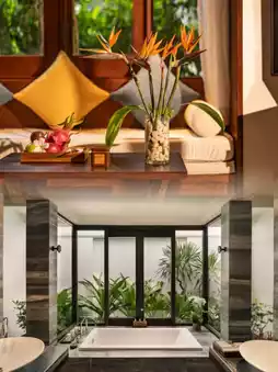 The Anam has a private beach with fine, soft sand that feels like walking on clouds. The water is a beautiful blue, with layers of color from light to dark. It's so beautiful, I was speechless. Walking along the beach, every photo is a masterpiece. The peaceful, healing atmosphere is amazing! The tropical gardens are also incredible, with rare plants and trees. Walking through them feels like being in a rainforest.