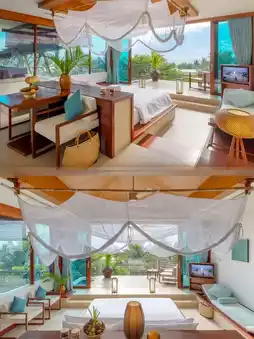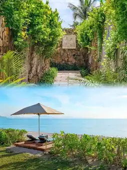 The hotel's location is unbeatable ๐, situated right on the beachfront, where the vast ocean meets the soft sandy beach. Gentle waves lap the shore ๐, and the sea breeze carries a refreshing ocean scent. Surrounded by lush tropical plants and vibrant flowers, the resort creates a perfect tropical getaway atmosphere. Witnessing the sunrise over the horizon ๐