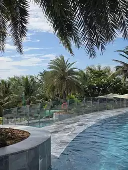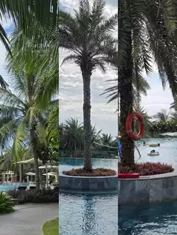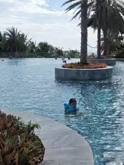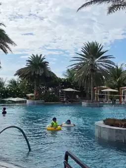 During the sunny daytime hours, the main pool is filled with a bright and warm atmosphere. Thanks to its open design, there are no shaded areas, allowing guests to fully enjoy the sunlight. The pool features a consistent depth and spacious layout, making it ideal for swimming. With ample space between people, it’s perfect for quiet conversations or spending time alone. The signature tranquil ambiance of Mövenpick Resort ensures a peaceful experience without any hustle and bustle. The water is meticulously maintained, offering a refreshing and clean environment at all times. The harmonious blend of the sky, the pool, and the distant trees creates a picturesque view. This is an ideal spot for travelers seeking effortless relaxation.