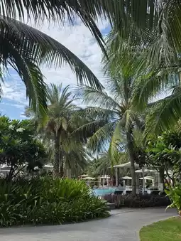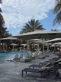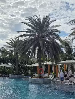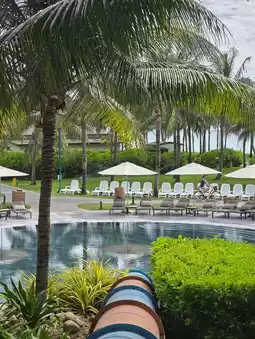The public pool at the Mövenpick Resort transforms into a more relaxed and tranquil atmosphere in the afternoon. The sunlight softens, and a gentle breeze caresses the water, creating a tranquil scene. At this time of day, there aren't many guests, so the only sound is the sound of the water. The sound of the ocean waves adds to the feeling of a small meditation space. It's the perfect place to lie under a parasol, read a book, or simply close your eyes and relax. The water temperature is just right, perfect for relaxing, and the water quality is always kept clean. The spacious pool allows for multiple groups to enjoy the tranquility of this afternoon.