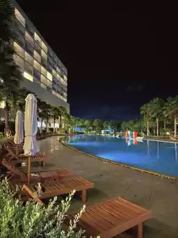 While enjoying a relaxing staycation at this resort-style destination with delicious food, you can also quietly indulge in the hotel pool while savoring mango shaved ice. Guests can access the private beach, coconut garden, and infinity pool in the villa area, providing a variety of water activities 💦.