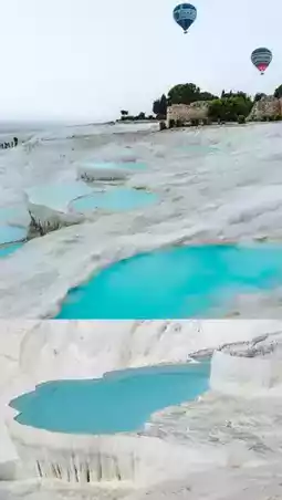 Next, head to Pamukkale, or "Cotton Castle," formed by natural hot springs flowing through limestone rocks, creating cascading, snow-white waterfalls. Not only is this place beautiful, but it's also a health resort, with minerals beneficial to the skin and body.